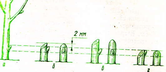 Весною, на початку сокоруху , сікатором проводите зріз підщепи на 2-3 мм вище заокулірованої бруньки , яка прижилась. Зріз робите під кутом 15-30º. Дивіться на малюнку під літерою "б"