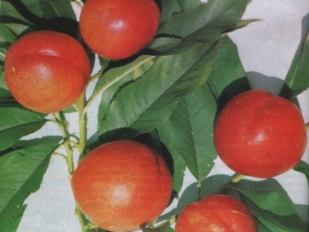 Плоди великі (111-130 г), округлі. Шкірка без опушення, блискуча, середньої товщини і щильності, з плода знімається погано. Основна окраска жовта, покрівна - з червоним рум"янцем у вигляді ярко-червоних крапок, які переходять в темно- карміновий кольор і займають 75-100% поверхні плода.