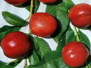 Плоди більші за середні масою 80-100 г, округлі, трохи продовгуваті, асиметричні. Шкірка без опушення, блискуча, щільна з плода знімається легко. Колір плода жовтий покритий червоним рум"янцем майже на 100%.