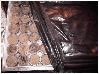 Другу частину кісточок я висіваю в лютому місяці в стаканчики разом з садінням насіння томатів для розсади. Особливо хороші результати дає садіння в стаканчики насіння аличі та шовковиці . Висіваю для своїх потреб по 100 шт. (фото 1 фото 2) В дні стаканчиків жалом паяльника необхідно зробити чотири отвори. Ґрунтову суміш я використовую ту, що продають в магазинах «Зелений світ» для вирощування розсади. Це субстрат універсальний "Кардаш". В стаканчики насипаю субстрат, потім розкладаю кісточки, що лежали в вологому піску, присипаю шаром піску товщиною в 2-3 см (фото 3), поливаю розовим розчином марганцівки. Стаканчики ставлю на піддон, надіваю поліетиленовий мішок (фото 1), щоб зберегти вологу і ставлю на пророщування в термошафу. Про будову термошафи розповім окремо.