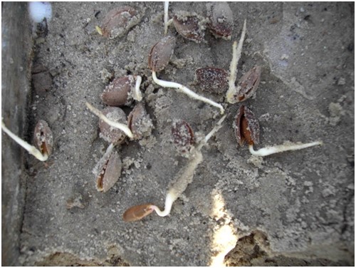 Третю частину кісточок висіваю весною. Для цього залишаю частину кісточок в вологому пісочку в підвалі для стратифікації. Якщо взимку багато снігу, то ящики з кісточками замотую в поліетиленові мішки та прикопують в сніг до весни. Кісточки взимку пройдуть стратифікацію та ранньої весни скидають кірку та проростають (фото 4).